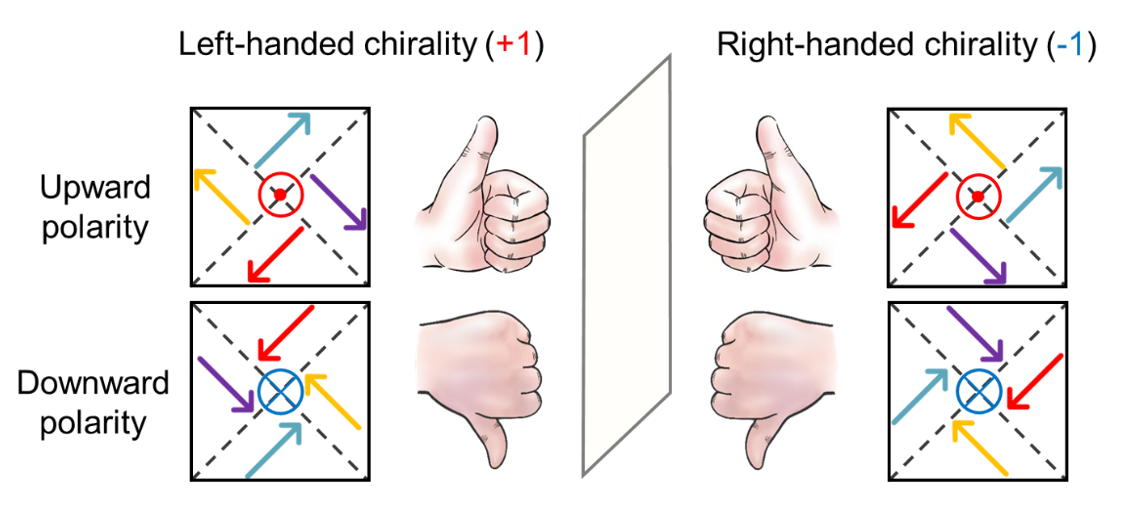 随后,研究团队采用脉冲激光沉积技术制备了La掺杂的BFO(LBFO)菱方相纳米岛,并通过角分辨压电力响应显微镜和扫描透射电子显微镜发现在该材料中存在自发形成的涡旋畴。由于底电极与铁电薄膜界面的内建电场,纳米岛的自发极化面外方向分量均表现为向上,而不同的纳米岛展现出旋向相反的面内方向分量。根据铁电材料中手性的定义(面外极性与面内旋性的组合,图2),具有涡旋畴的LBFO铁电纳米岛应该具有光学手性。
