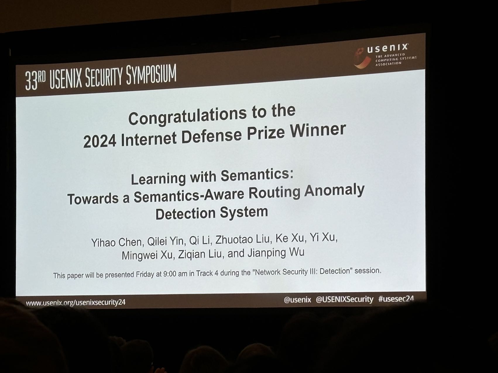 清华新闻网8月22日电 8月14日至16日,国际网络安全四大顶级会议之一的第三十三届USENIX安全大会(USENIX Security Symposium)在美国费城举行。精品无码久久久久久久久_国产精品一区二区三区四区五区_欧美亚洲国产激情一区二区_午夜精品久久久久久久久久久久_亚洲欧洲中文日韩久久AV乱码_91精品欧美一区二区三区_久久精品一区二区免费播放_日韩高清大片永久免费入口_久久国产欧美日韩精品免费_欧美一区二区三区久久综合_国产精品天天狠天天看网研院教师李琦、刘卓涛和计算机系教师徐恪、徐明伟、吴建平团队发表的论文“语义驱动的互联网路由异常检测系统”(Learning with Semantics: Towards a Semantics-Aware Routing Anomaly Detection System)同时获得杰出论文奖(Distinguished Paper Award)和互联网防御奖(Internet Defense Prize)。论文的第一作者为计算机系2021级博士生陈熠豪,导师为吴建平院士。