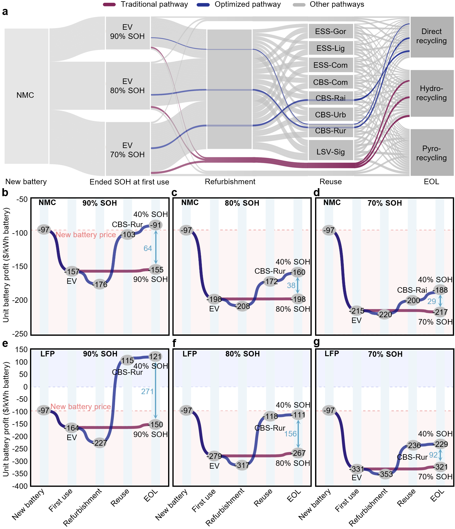 团队进一步对比评估了不同类型退役电池在生命周期中的经济效益和碳足迹(图4)。LFP电池在整体经济效益上优于NMC电池,但其碳足迹在首次使用和再利用阶段高于NMC电池,两者在再利用阶段的碳足迹趋势也不同。这表明,不同参数电池在同样的再利用和回收场景中会得到不同的经济效益和碳足迹,突显了整体路径设计的重要性。