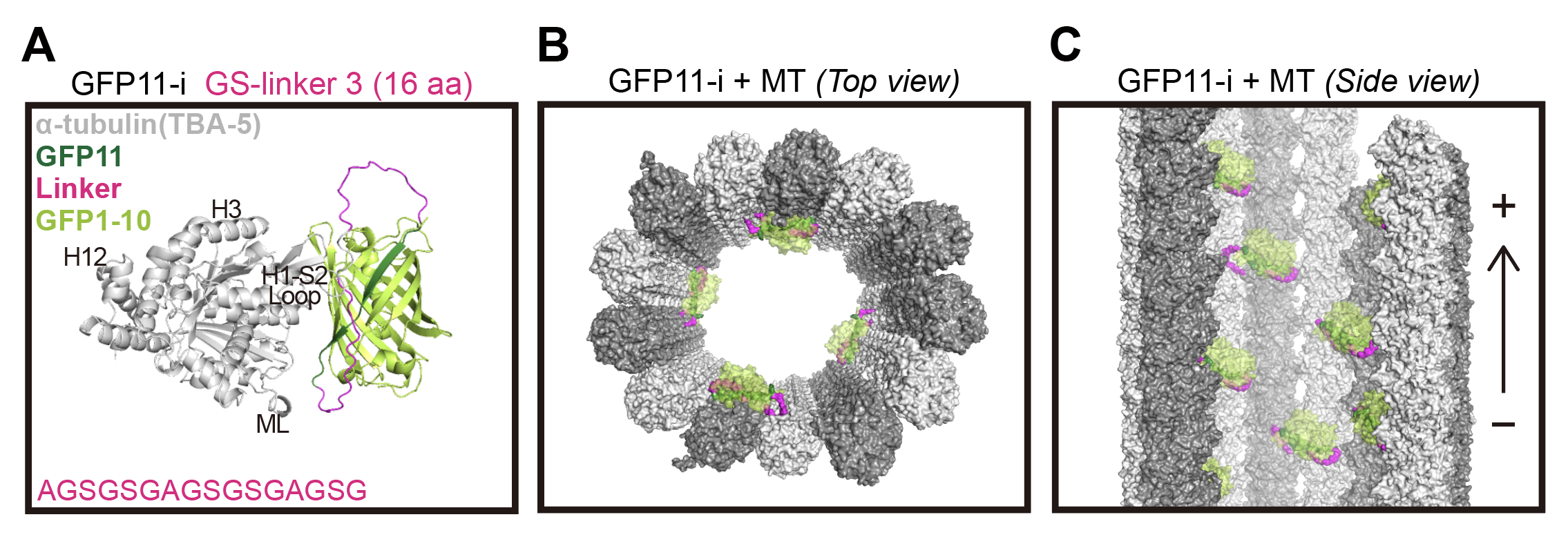 研究人员利用AlphaFold2在split-GFP荧光互补标记技术的基础上进行了键改进。首先将16个氨基酸的GFP11短标签精准插入至α-或β-微管蛋白的非保守H1-S2 loop区,然后利用AlphaFold2进行结构预测,优化了GFP11两端的连接子序列,确保GFP11与GFP1-10互补片段之间的稳定互作,从而产生更强的荧光信号(图1A)。通过AI技术的辅助,以及结构匹配和分子模拟结果表明,该策略(GFP11-i)成功将split-GFP蛋白标记在微管的中空管腔内侧,既不影响微管蛋白的折叠成熟过程,也不破坏微管的整体结构与基本功能(图1B-C)。