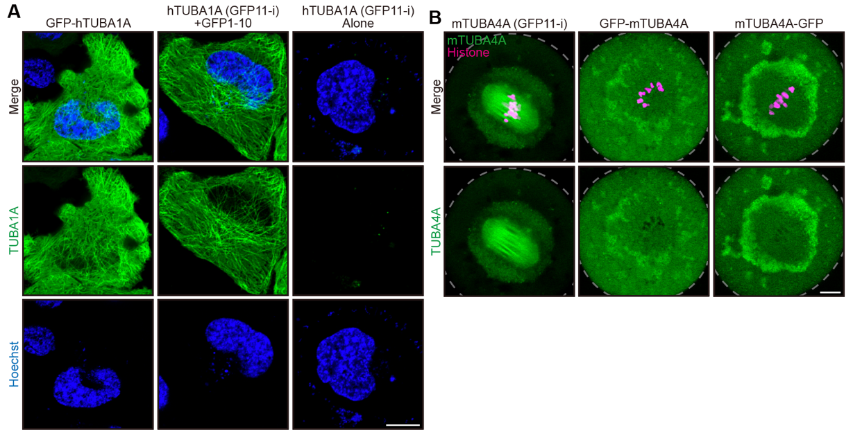 进一步,研究人员在秀丽隐杆线虫中采用基因敲入(knock-in)策略,对内源的α-或β-微管蛋白进行了GFP11-i标记。结果显示,与传统的GFP标记方法相比,GFP11-i标记对体内如胚胎分裂、纤毛发生等与微管相关的重要生物过程的干扰更小,同时实现了对内源微管蛋白亚型的组织特异性标记,并且能够对突变微管蛋白进行高保真(低损伤)的活体标记与动态示踪。通过在人源HeLa细胞系中转基因表达GFP11-i标记的人源微管蛋白TUBA1A(图2A),以及在小鼠卵细胞中表达GFP11-i标记的TUBA4A(图2B),研究展现了GFP11-i在哺乳动物系统中对微管蛋白的高标记效率。