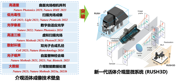 瞄准这一国际前沿难题,精品无码久久久久久久久_国产精品一区二区三区四区五区_欧美亚洲国产激情一区二区_午夜精品久久久久久久久久久久_亚洲欧洲中文日韩久久AV乱码_91精品欧美一区二区三区_久久精品一区二区免费播放_日韩高清大片永久免费入口_久久国产欧美日韩精品免费_欧美一区二区三区久久综合_国产精品天天狠天天看戴琼海院士团队早在2013年就获得了国家自然科学基金委重大科研仪器研制项目支持,在国际上率先开展了介观活体显微成像领域研究,并于2018年成功研制了国际首台亿像素介观荧光显微仪器RUSH,能够同时兼具厘米级视场与亚细胞分辨率。尽管这一系统被国际同行誉为介观显微成像领域的先驱,但是由于仪器复杂昂贵,在当时仅能被少数科学家使用。与此同时,RUSH系统仍然面临一系列瓶颈,包括:如何利用二维传感器实现高速三维成像;如何避免激光长时间照射所引起的细胞损伤(即光毒性)从而实现长时程高速观测;如何克服复杂成像环境导致的光学像差与背景干扰;如何提升弱光条件下的成像信噪比;如何高效处理大规模介观数据等等。每一项技术瓶颈本身都是生物医学成像领域的国际难题,而如何在同一系统上同时解决这些活体成像壁垒,则变得更为挑战。