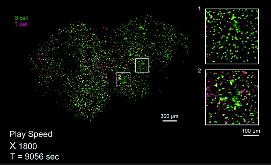 RUSH3D系统为研究大规模细胞交互提供了前所未有的工具。例如,生发中心(Germinal center, GC)是被抗原激活后的B细胞在趋化作用引导下聚集形成的组织结构,对于自身免疫性疾病、疫苗、病毒感染等过程都至关重要。由于受到视场和拍摄时长的限制,免疫细胞如何参与多个GC生成以及如何在多个GC间进行迁移的过程从来没有被连续记录过,从而限制了该领域的发展。团队利用RUSH3D对小鼠腹股沟附近淋巴结在免疫反应85个小时左右进行了长达十数小时的高速三维成像,完整记录了B细胞参与多个GC生成的过程。与此同时,观测到在免疫反应145个小时GC已经完全形成之后,一些T细胞在多个GC之间完整迁移的过程,预示了T细胞可能参与了GC之间的信息交流和传递。这些对信使T细胞在不同生发中心之间交流信息的观测有望带来我们对免疫过程的全新认识。