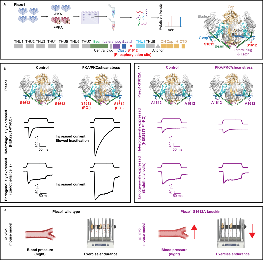 S1612磷酸化位点的鉴定以及S1612磷酸化对Piezo1介导机械激活电流的调控和生理学功能影响示意图
