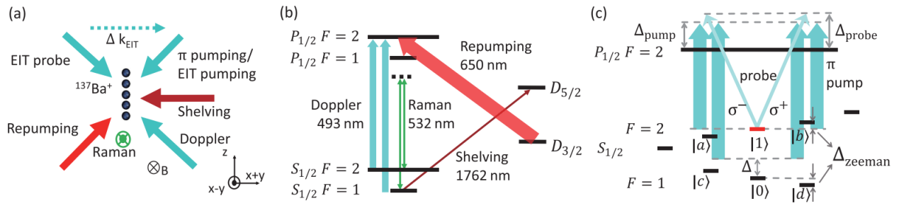 离子阱是一个强大而多功能的平台,在量子信息处理(QIP)、精密光谱学和基础物理测试等领域具有广泛的应用。为了实现高保真量子信息处理,研究人员需要将离子的相关运动模式冷却到尽可能低的温度。电磁感应透明(EIT)冷却可以提供较快的冷却速率和较宽的冷却带宽,同时保持了较低低冷却极限(n¯≈0.1),使其成为大离子晶体量子计算和量子模拟的合适冷却方法。然而,对于在低或中等磁场下具有高核自旋I>1/2的离子,由于难以找到孤立的Λ能级结构,如何实现有效的EIT冷却是具有挑战性的。