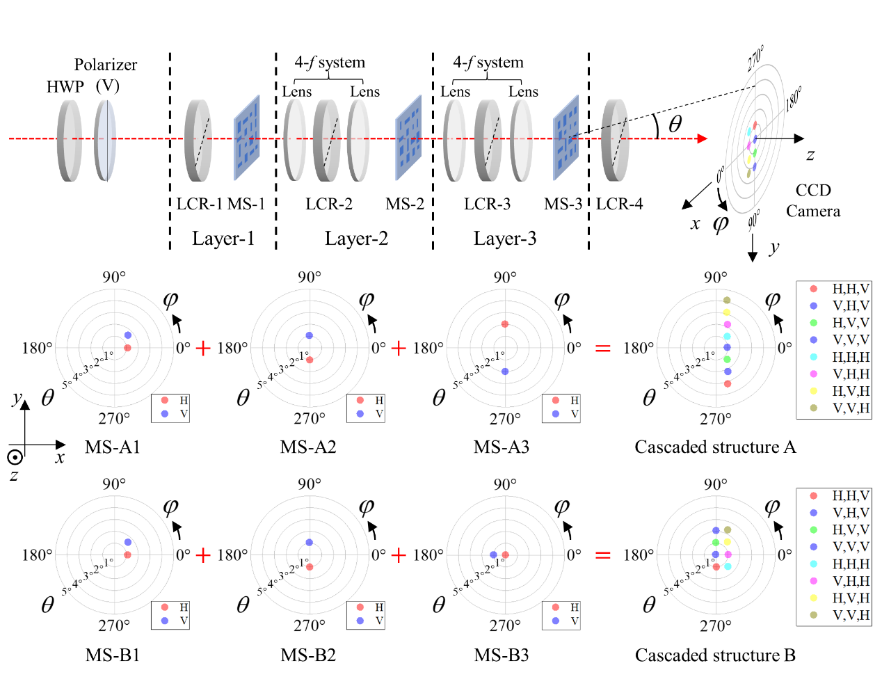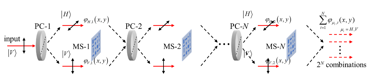 为了提升通道数量,研究团队采用N个偏振相关超表面进行级联,同时在每个超表面前增加一个偏振控制器,使得该超表面的输入光可在2个正交偏振态间切换。此时,整个级联结构中的光偏振态将具有2N种组合,对应的等效波前操控模板也具有2N种情况。然而,这些模板间具有相关性,自由度仅为N+1,无法对应2N个任意的功能进行设计。