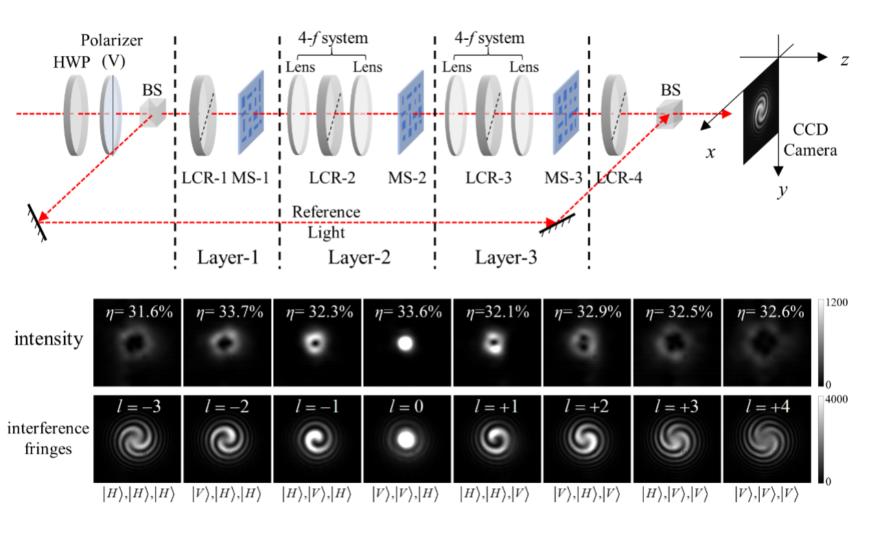 实验上,研究团队通过3层超表面的级联架构实现了8通道可调阶次的涡旋光束产生以及8通道动态波束偏转,对上述方案进行了验证。基于不同的超表面级联组合,涡旋光束的拓扑荷数(topological charge, TC)可在l=-3~+4或l=-1~-8间切换,前者效率在31.6%~33.7%范围内。波束偏转的方向可按8×1一维排列或4×2二维排列,效率均在15%~25%范围内。同时,所使用的偏振控制器均为可电调的液晶偏振延迟器(liquid crystal phase retarder),因此该实验架构可以电调切换通道。
