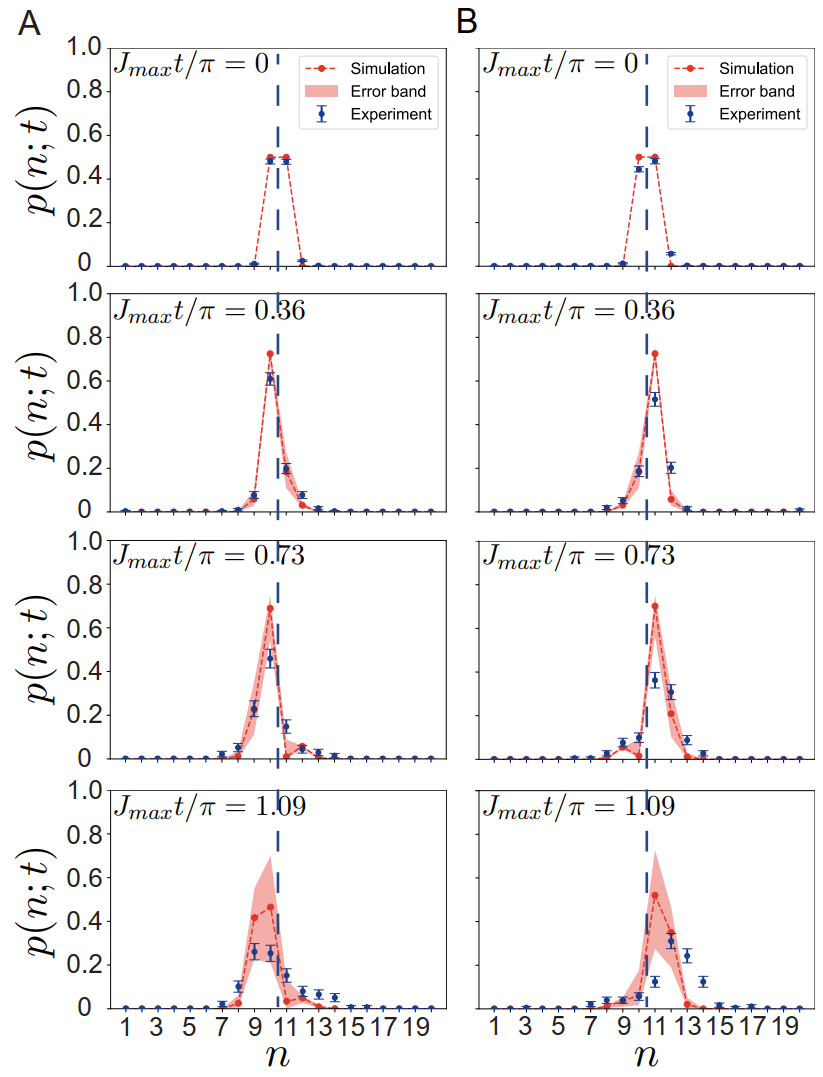 为了明确验证拓扑缺陷叠加态的量子相干性,研究人员进一步利用21离子制备了自旋扭结在相邻位置的量子叠加态。通过控制该叠加态的相对相位,研究人员观察到自旋扭结选择性地向不同方向传播,从而排除了经典概率的传播方式,验证了叠加态的量子相干性。