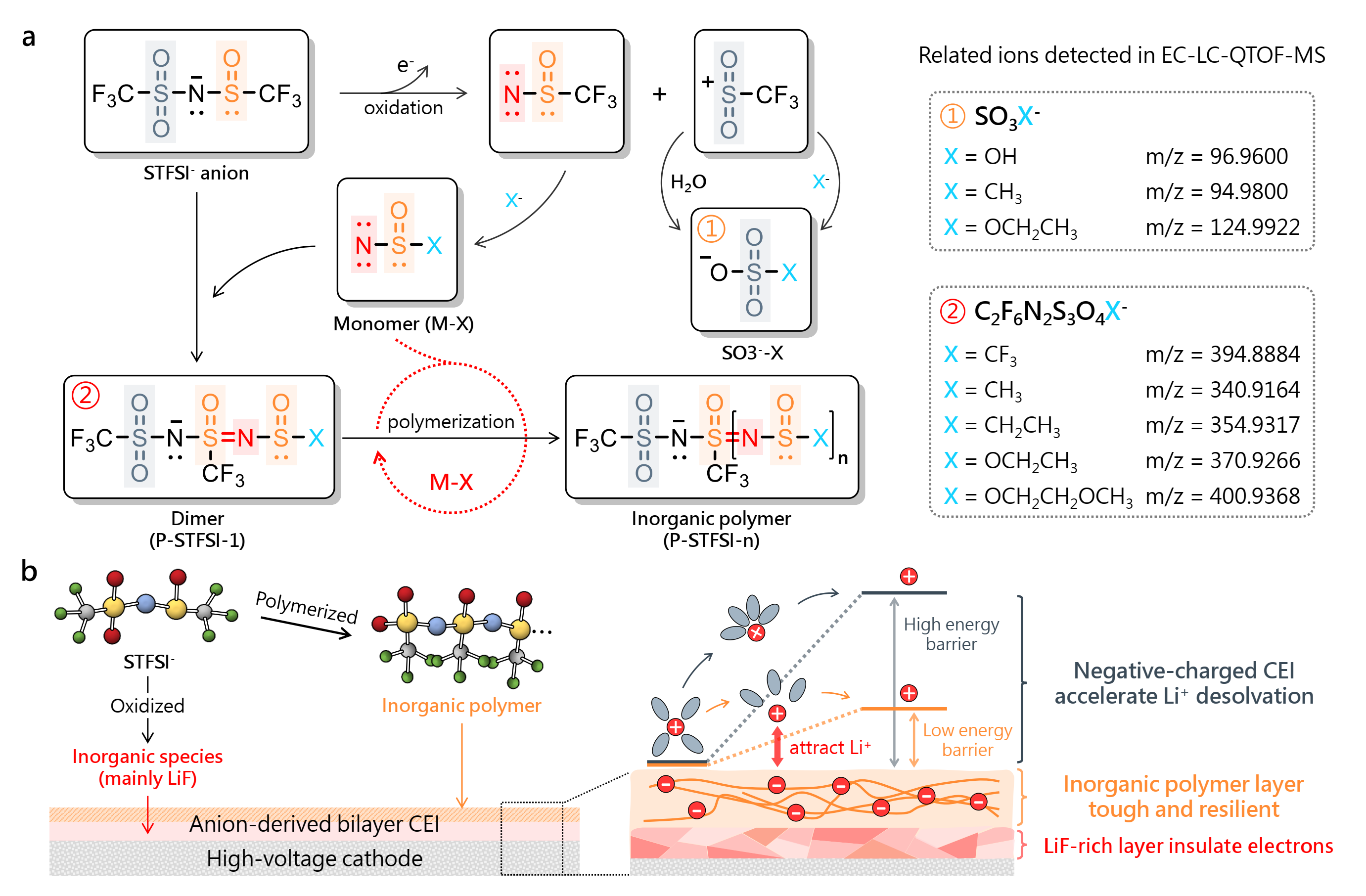 图2.STFSI-阴离子的电化学氧化耦合聚合机理及其衍生的界面化学