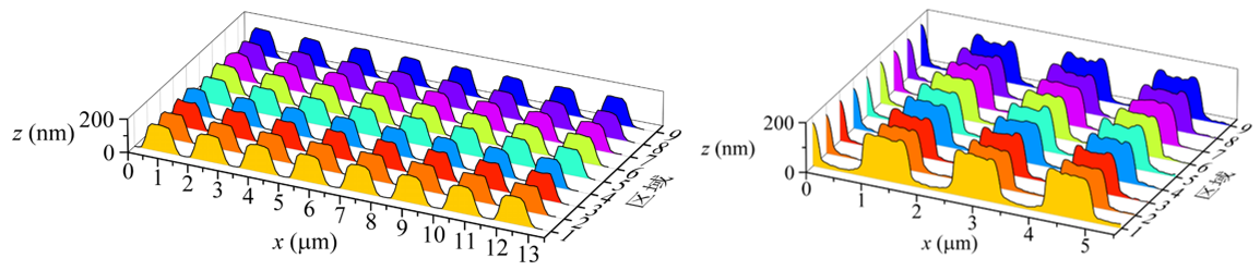 进一步地,使用原子力显微镜(AFM)对样品1中3×3区域的每个曝光区域随机选择一个点进行AFM测量,其槽型如图4所示。首先以较低分辨率进行较大面积的扫描,再以高分辨率进行小面积的扫描。图5为AFM测量结果的截面图,各区域槽型具有较好的一致性。