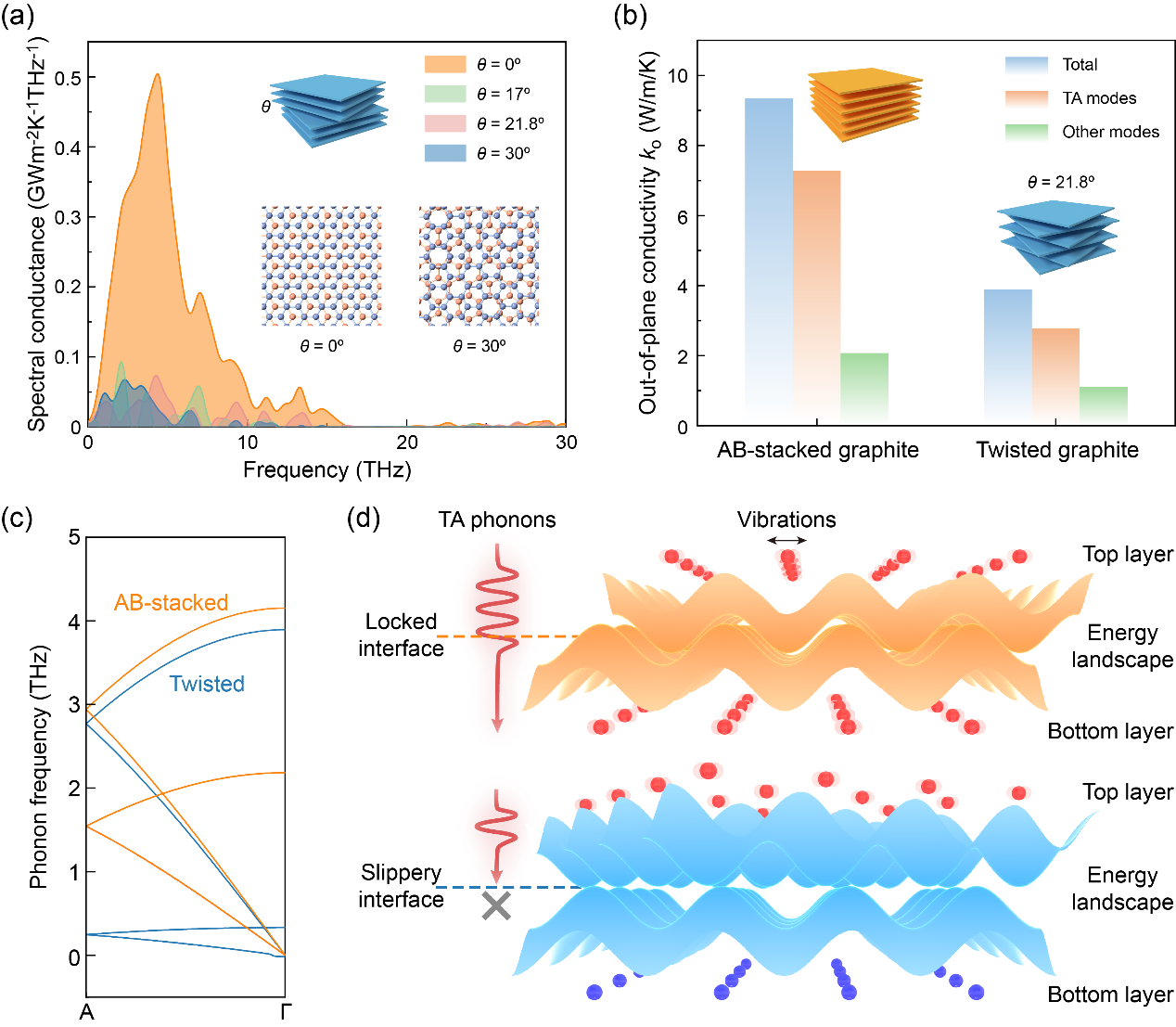 然而,这种奇特的结构超滑界面的热输运特性却始终笼罩在迷雾之中。尽管人们对石墨优异的热学性质早有研究并加以利用,但其中新奇的热输运现象,比如声子水力输运和第二声,至今仍存在许多未解之谜。而或许更令人意外的是,石墨的本征热导率,事实上也仍无定论。这侧面反映了对于石墨这种层状材料的导热研究的挑战。而对于石墨内“深埋”的超滑界面,其热测量则更加困难。因此,尽管有一些理论计算工作讨论了层间转角对于界面导热特性的影响,可靠的实验测量仍鲜有报道。而这对于深化声子输运的机理认识,以及基于石墨的器件热管理和芯片散热都十分重要。