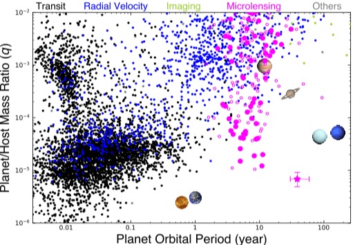 图2.不同方法探测到的系外行星的轨道周期和与主星的质量比分布。品红色星形表示本研究发现的位于土星轨道之外的超级地球。实心品红色圆点代表本工作的统计样本,其包含63颗来自于KMTNet巡天的微引力透镜行星。空心品红色圆点则为同为微引力透镜方法探测到的其他行星。该样本揭示了在类似木星轨道上有两类行星种群:超级地球与气体巨行星