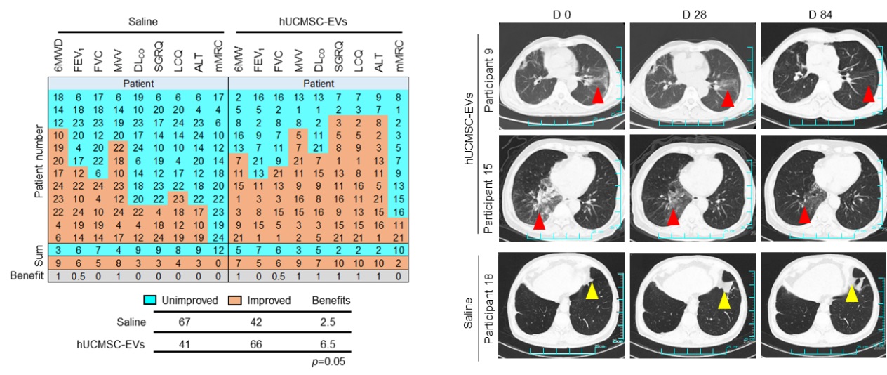 在临床层面,团队开展了一项编号为MR-46-22-004531(ChiCTR2300075466)的I期临床试验,采用随机、单盲、安慰剂对照设计,共纳入24名肺纤维化患者。结果显示,雾化吸入人脐带间充质干细胞来源外泌体治疗安全性良好,未出现严重不良事件。与仅接受常规治疗的对照组相比,接受联合治疗的患者在肺功能(用力肺活量FVC、最大自主通气量MVV)和呼吸健康状态(通过圣乔治呼吸问卷和莱斯特咳嗽问卷评估)方面均显著改善。值得关注的是,其中两例炎症后肺纤维化患者在治疗后影像学检查显示病灶显著改善,提示该疗法具有潜在的肺纤维化逆转能力。