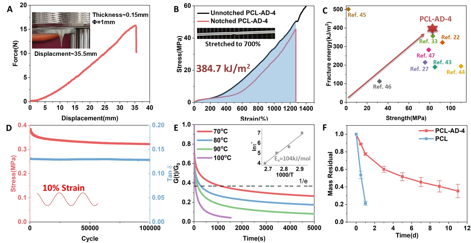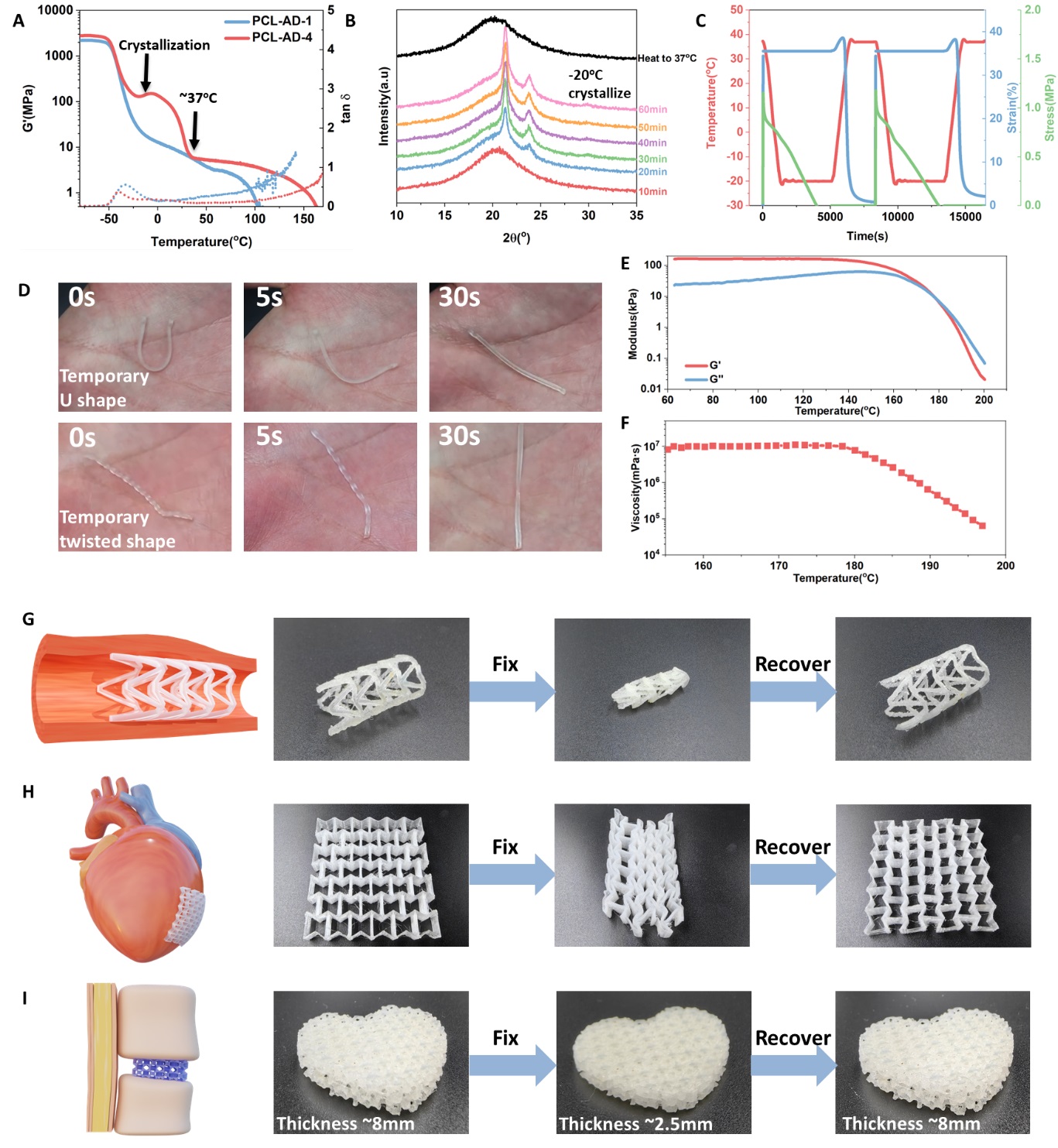 大多数已报道的类软组织弹性体通常存在一些限制,例如需要较弱的交联来确保其固有的柔软性,但这导致了强度和抗撕裂性能较差。此外,形状记忆性能通常难以与出色的机械性能兼得。更重要的是,医用材料的形状记忆希望在体温下发生,这需要精确控制玻璃化转变温度或晶体熔点。此外,生物相容性和生物降解性对于医用材料来说也至关重要。因此,解决上述问题需要平衡诸如强/弱、刚性/柔性以及结晶/非晶结构等众多矛盾和挑战。