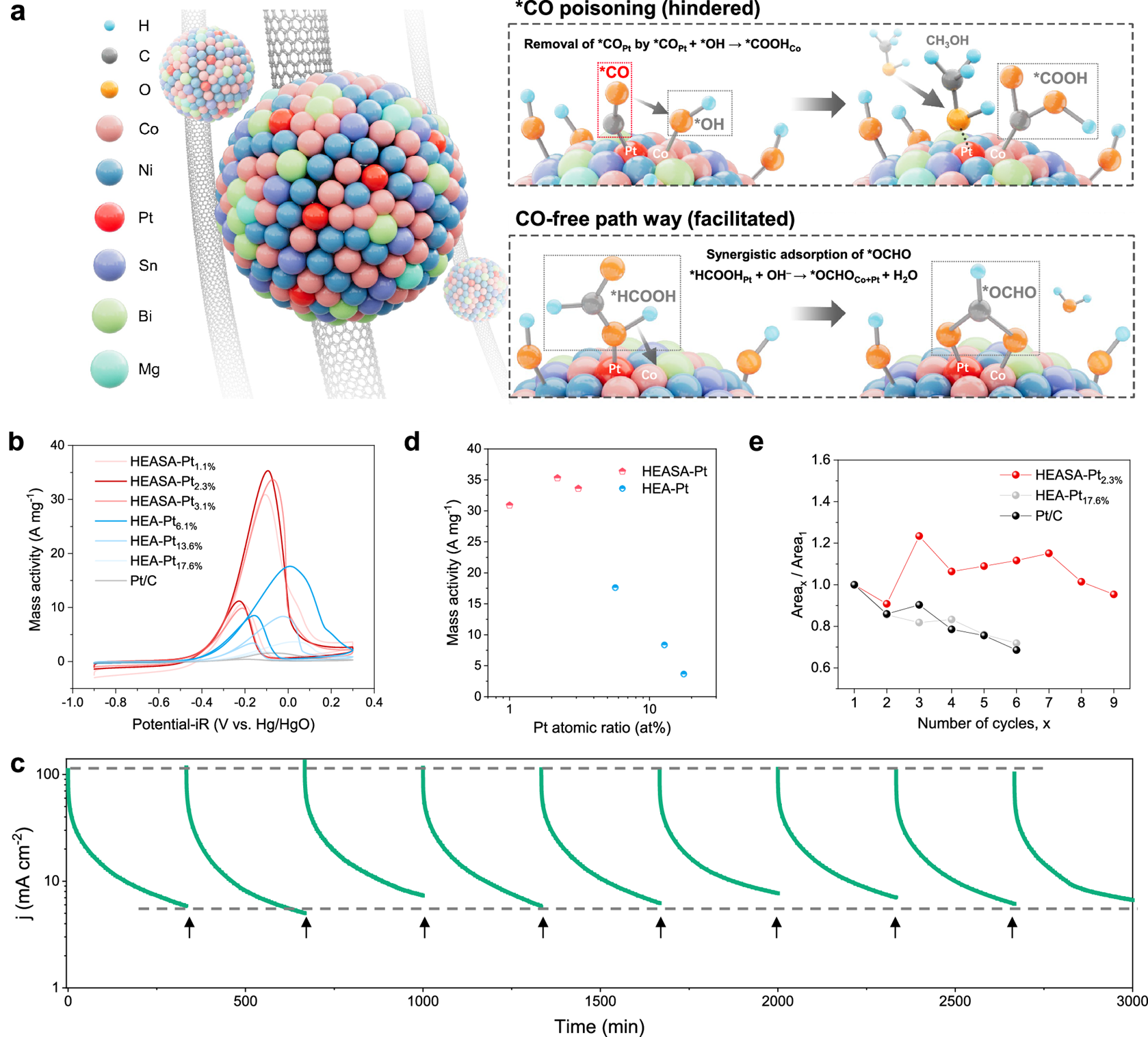 相关研究成果以“用于甲醇催化氧化的高熵合金化Pt单原子”(High-entropy alloyed single-atom Pt for methanol oxidation electrocatalysis)为题,近日在线发表于《自然·通讯》(Nature Communications)。