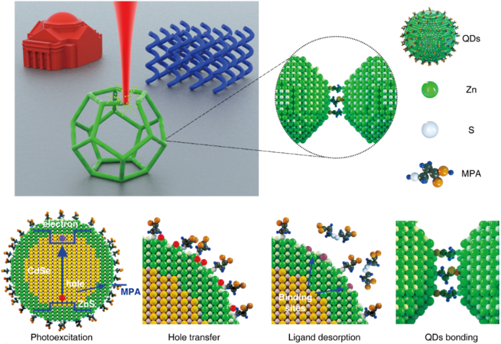 针对以上难题,研究团队提出了光激发诱导化学键合的新原理,实现了纳米粒子的激光三维装配技术,以各种纳米粒子作为原料来组装三维纳米器件。以核壳结构的半导体量子点为例(图1所示),利用激光激发量子点产生电子-空穴对,通过能级匹配,驱动光生空穴的隧穿和表面迁移,促使量子点表面配体脱附并形成活性化学位点,进而诱导量子点的表面化学成键,实现量子点之间的高效组装。
