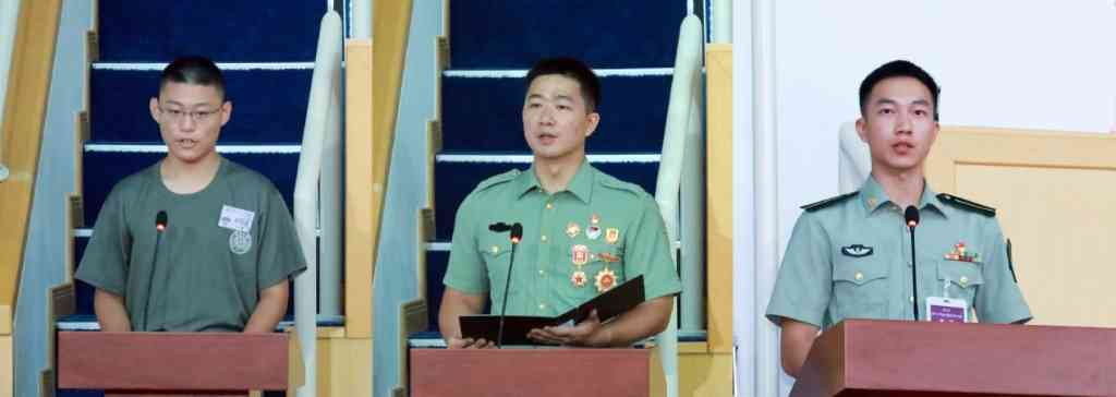 三营24连、笃实书院2024级本科生朱阅澍代表参训新生发言,退役大学生士兵代表、土木系2018级本科生肖航分享从军经历,军训旅四营营长、陆军防化学院雷雨代表全体教官发言。