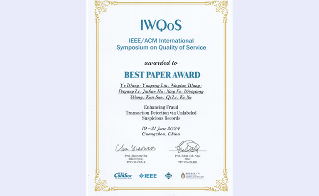 清华新闻网7月23日电 近日,IEEE/ACM国际服务质量学术研讨会(IEEE/ACM International Symposium on Quality of Service,简称IWQoS)在香港科技大学(广州)举办。精品无码久久久久久久久_国产精品一区二区三区四区五区_欧美亚洲国产激情一区二区_午夜精品久久久久久久久久久久_亚洲欧洲中文日韩久久AV乱码_91精品欧美一区二区三区_久久精品一区二区免费播放_日韩高清大片永久免费入口_久久国产欧美日韩精品免费_欧美一区二区三区久久综合_国产精品天天狠天天看网络研究院教师李琦和计算机系教师徐恪团队发表的论文“基于未标记可疑记录的欺诈交易检测增强”(Enhancing Fraud Transaction Detection via Unlabeled Suspicious Records荣获本次会议唯一最佳论文奖(Best Paper Award)。