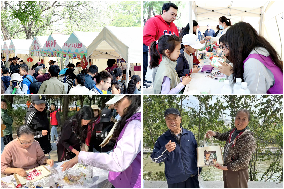 在紫竹院街道长河惠民市集,新闻学院研团总支、研究生碳中和志愿服务队开展手工麻布包制作和碳减排志愿实践活动,居民在穿针引线间增强环保认知,践行低碳环保理念。